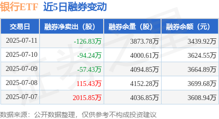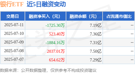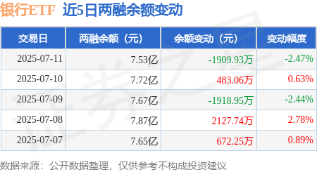 本站消息,7月11日,银行ETF(512800)融资买入6202.76万元,融资偿还7928.05万元,融资净卖出1725.3万元,融资余额7.19亿元,近20个交易日中有12个交易日出现融资净买入。