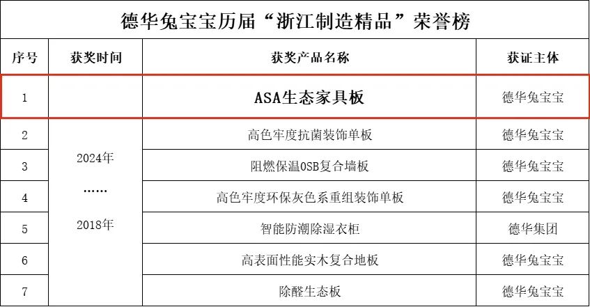 这是兔宝宝连续第五年入选“浙江制造精品”榜单,七款优质产品相继上榜,包括除醛生态板、智能防潮除湿衣柜、ASA生态家具板等,充分体现了公司在产品质量和科技创新方面的持续升级与卓越品质追求上的硬核实力。